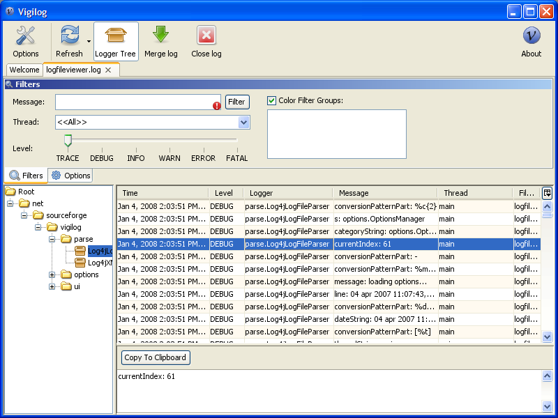 Filter log entries on the message, a certain thread or the level with a easy-to-use interface (Screenshot). This animated gif shows the filtering in action. First, the message is filtered by typing 'op', then the 'main' thread is selected from the list.